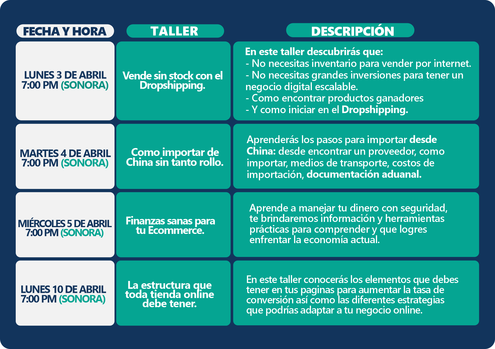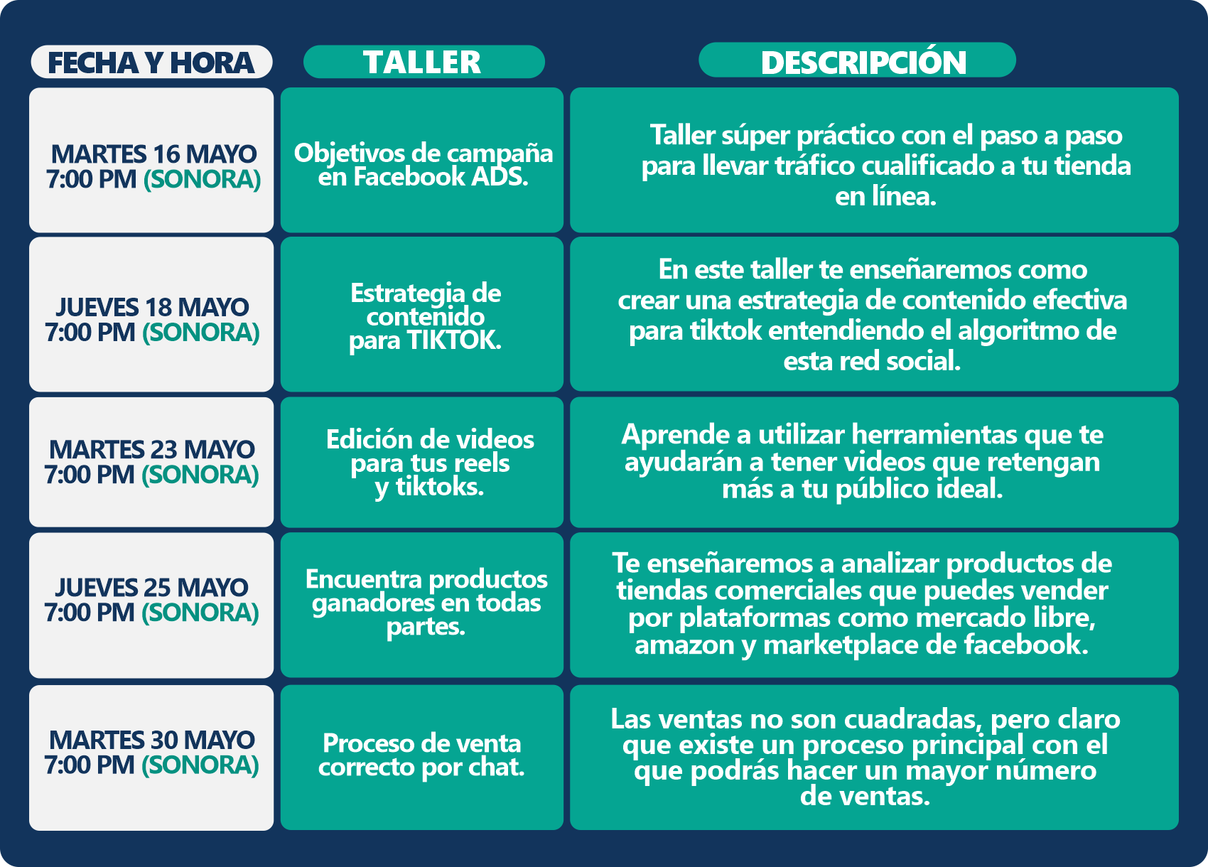 Esto no termina, todos los meses estaremos teniendo talleres en línea en los cuales podrás asistir sin costo adicional solo por ser parte de la comunidad de Mexico Ecommerce Experience, aquí te dejamos el calendario de los días faltantes de mayo y por el grupo de Facebook estaremos publicando los meses posteriores, así que no dudes en ser parte de esta increíble comunidad